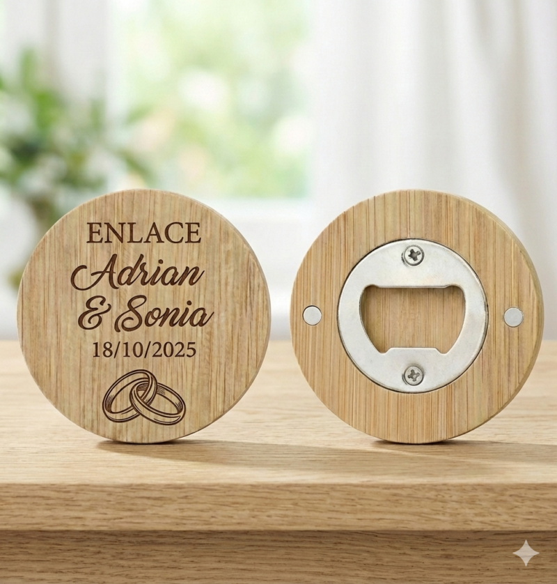 Olvídate de los típicos regalos que acumulan polvo. Nuestro abridor personalizado de madera es el equilibrio perfecto entre elegancia rústica y utilidad diaria. Al tener imanes integrados en la parte trasera, tus invitados podrán tenerlo siempre a mano en la puerta del frigorífico.