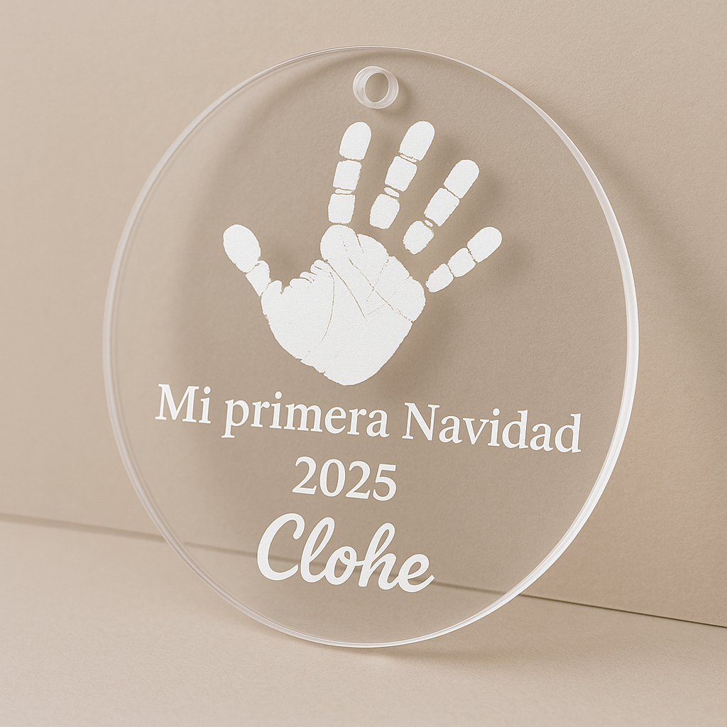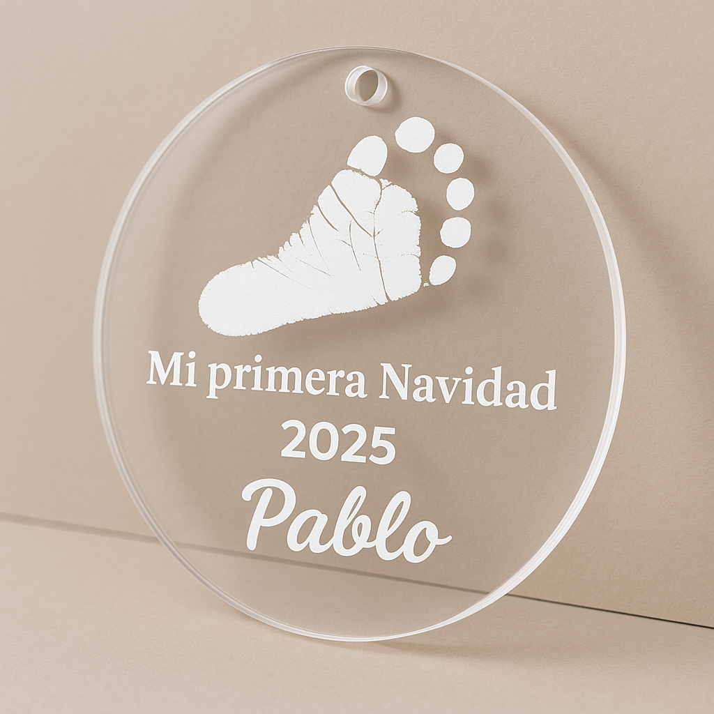Celebra ese momento tan especial con este adorno personalizado de “Mi Primera Navidad”, grabado sobre metacrilato transparente de alta calidad.