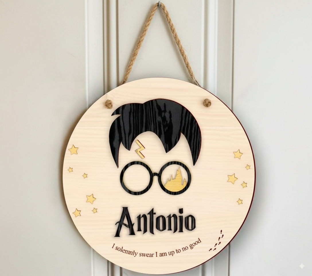 Decora la puerta o pared de la habitación con este mágico cartel personalizado Harry Potter con nombre, inspirado en la mítica saga. Fabricado en madera, con diseño grabado e impreso que incluye el icónico cabello, gafas y cicatriz del joven mago, junto al nombre personalizado que elijas. Ideal para fans de todas las edades.