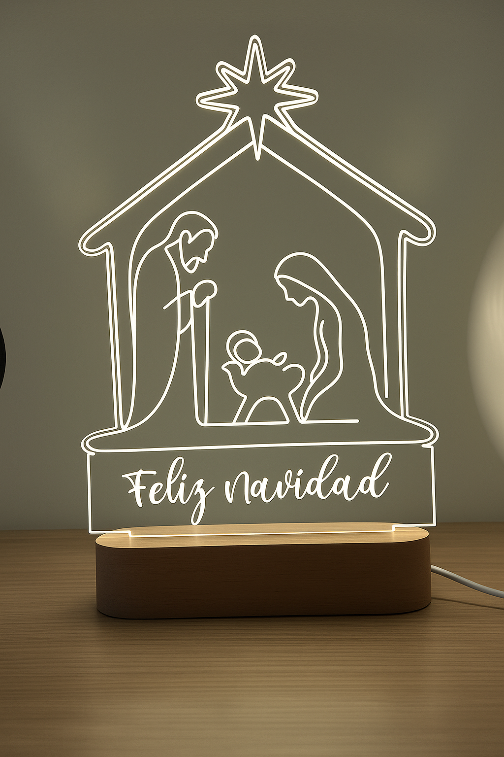 Esta lámpara LED del Nacimiento combina sencillez y elegancia en un diseño grabado sobre metacrilato transparente. Representa a María, José y el Niño Jesús bajo la estrella de Belén, iluminados con una luz cálida que crea un ambiente acogedor y navideño.