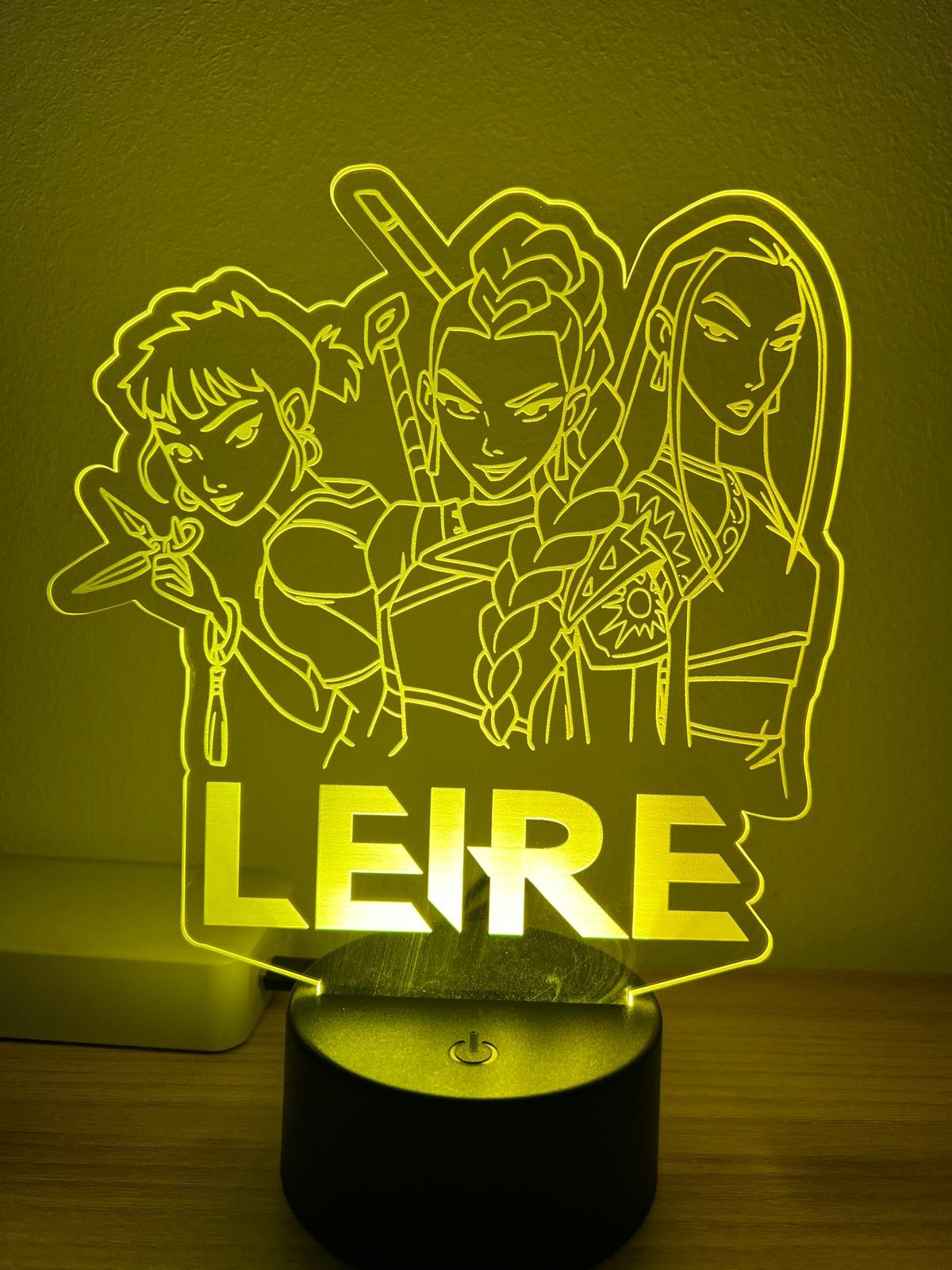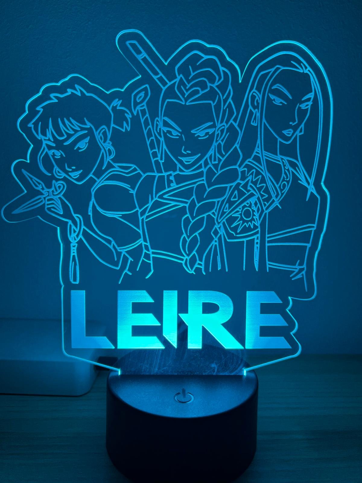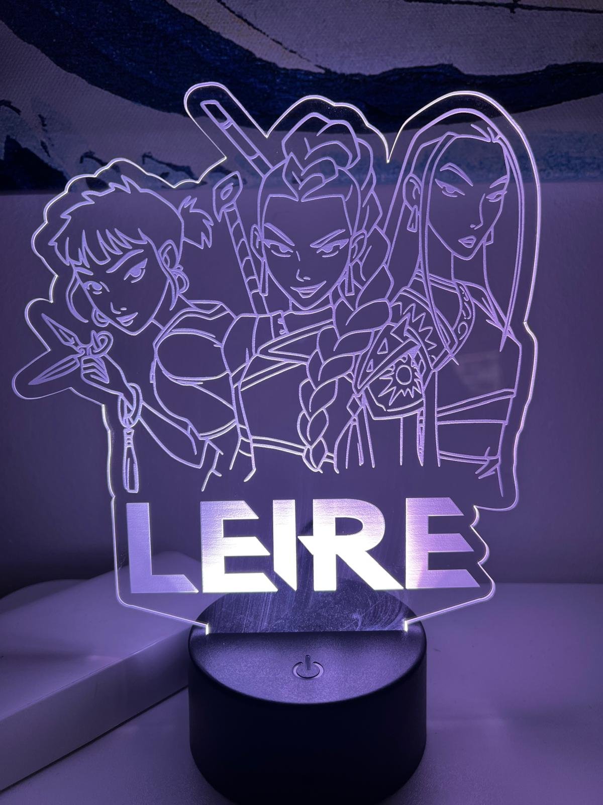 Si buscas un regalo diferente o una decoración con personalidad, esta lámpara LED con estética K-Pop es perfecta: un diseño moderno en placa transparente (tipo metacrilato) con ilustración y el nombre personalizado grabado/impreso en grande, como en el ejemplo de la foto.