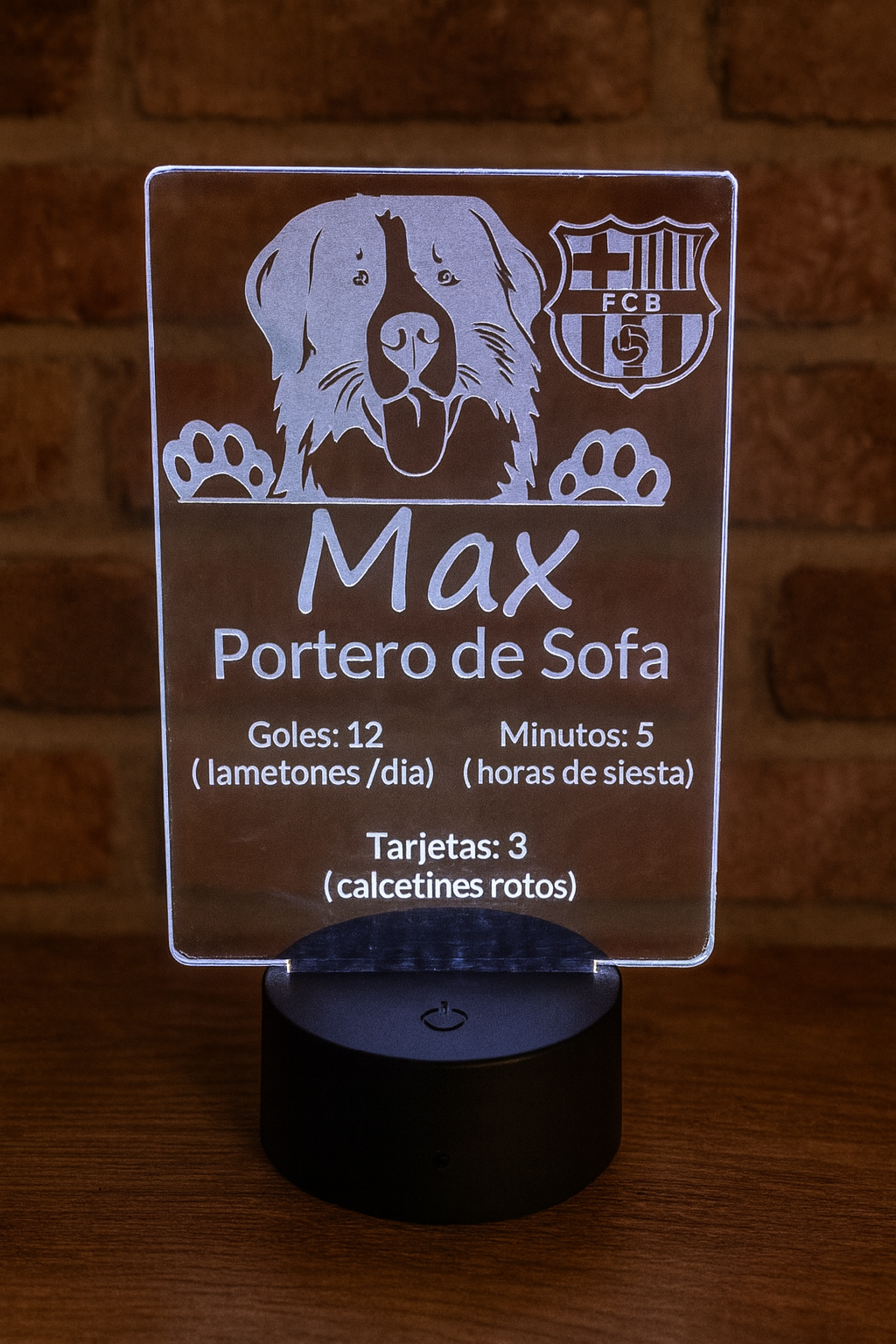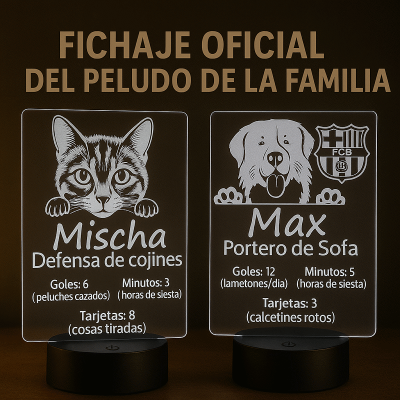 Tanto si tu felino es “Defensa de cojines”, como si tu perro es un “Portero de sofá”, adaptamos la frase y las estadísticas para que la lámpara represente su esencia de forma tierna y divertida. Además, incluimos el escudo del equipo que más os guste (Real Madrid, Barça, Betis, Sevilla, etc.).