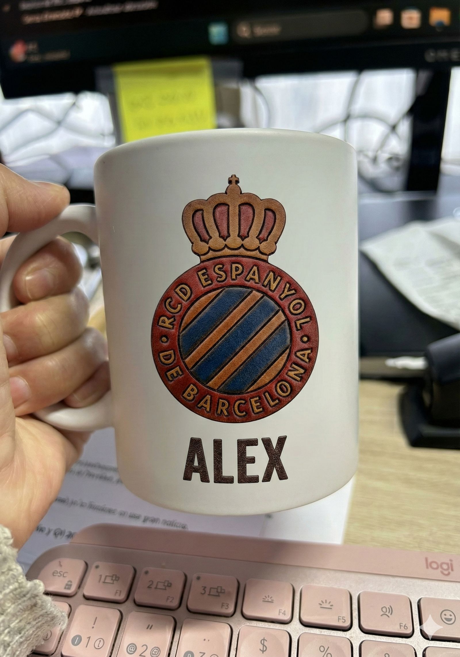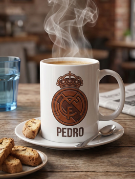 Olvídate de las tazas de merchandising convencionales. Hemos diseñado una pieza única para los verdaderos apasionados del fútbol que buscan estilo y distinción. El acabado blanco mate de la cerámica hace que el diseño resalte de forma espectacular.