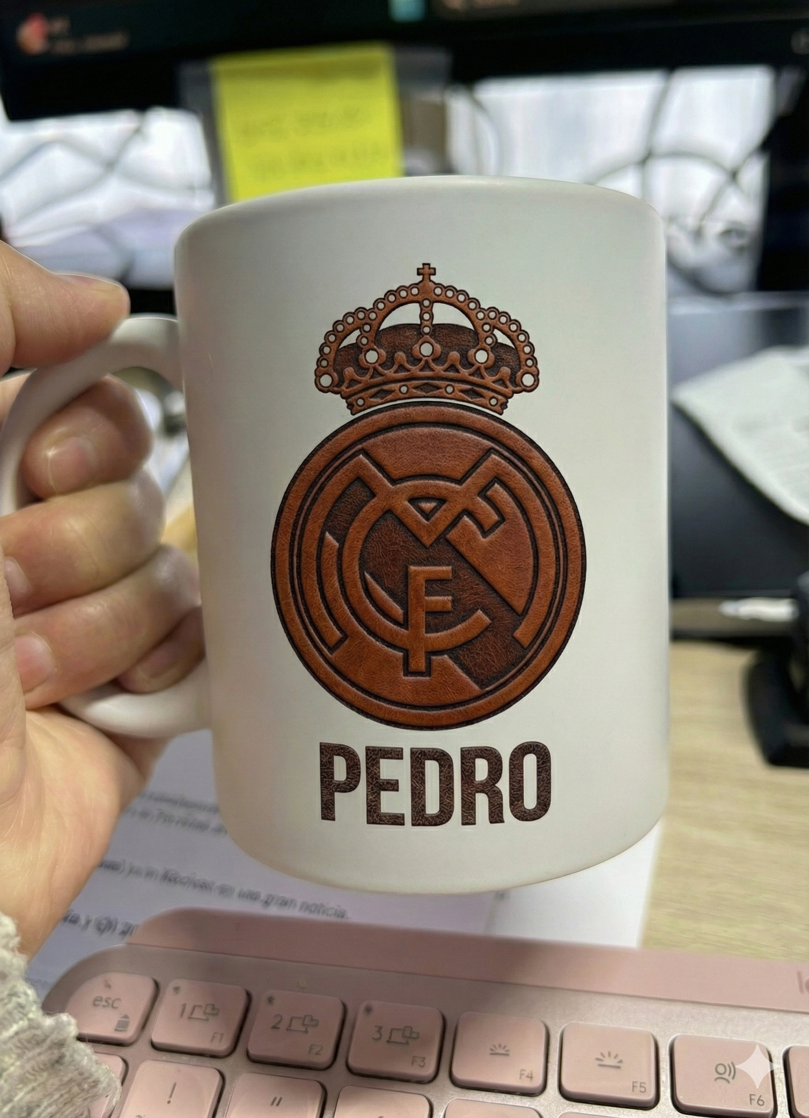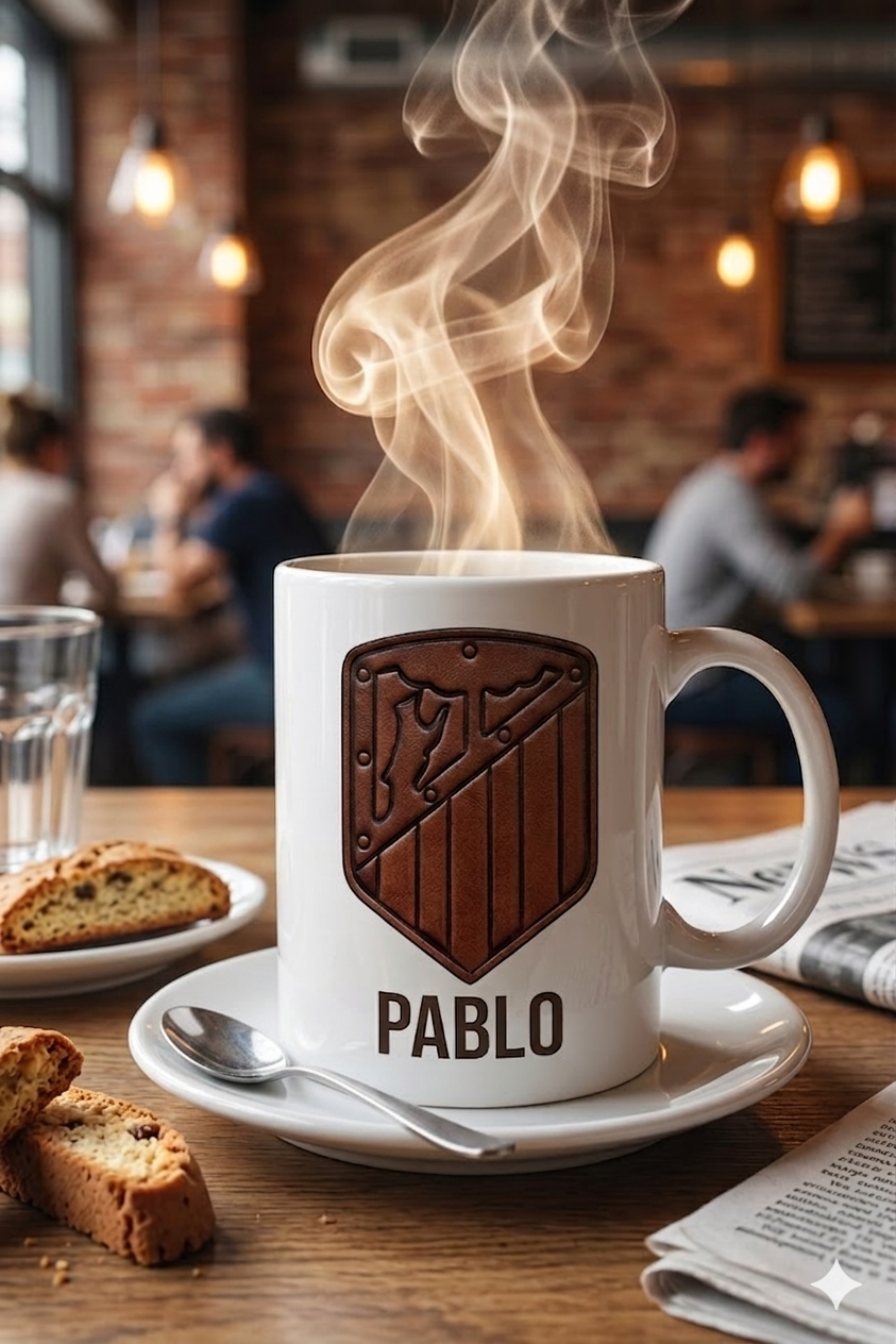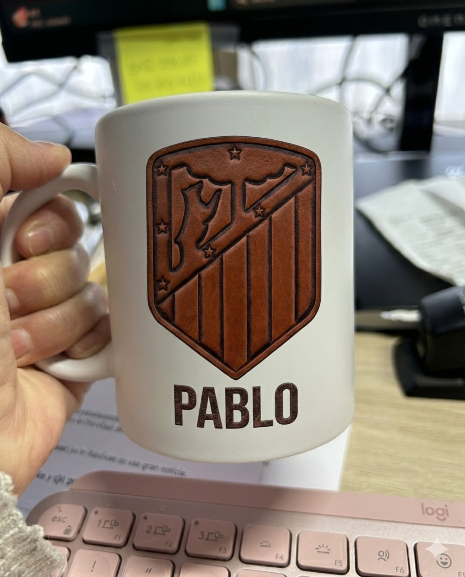 La magia de esta taza reside en su impresión. Recreamos digitalmente la textura, el color y el desgaste del cuero antiguo sobre el escudo y tu nombre. Visualmente parece piel curtida grabada sobre la taza, aportando un toque rústico y vintage.